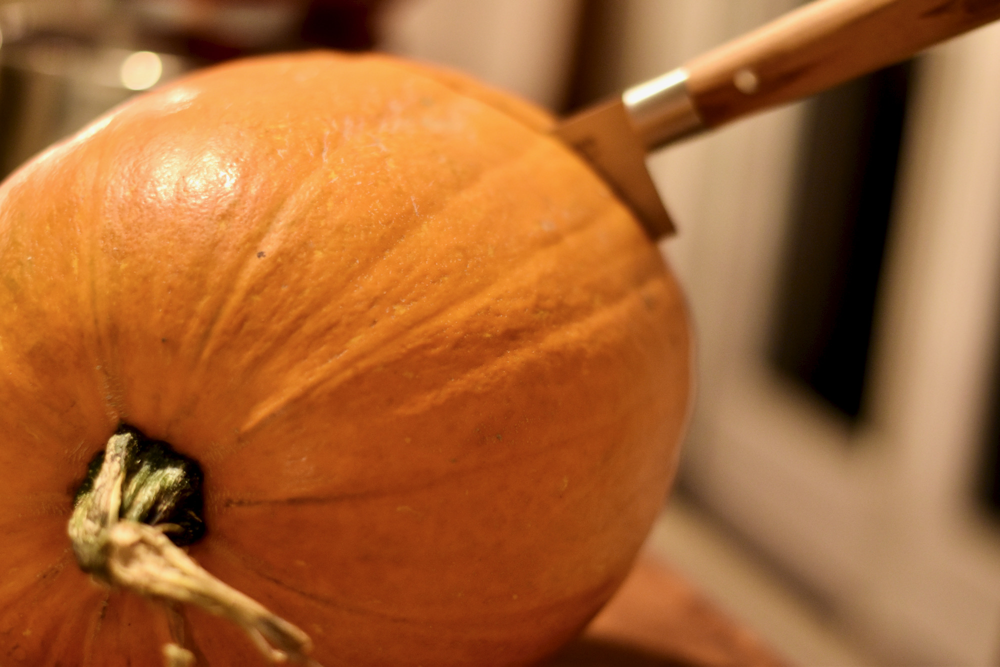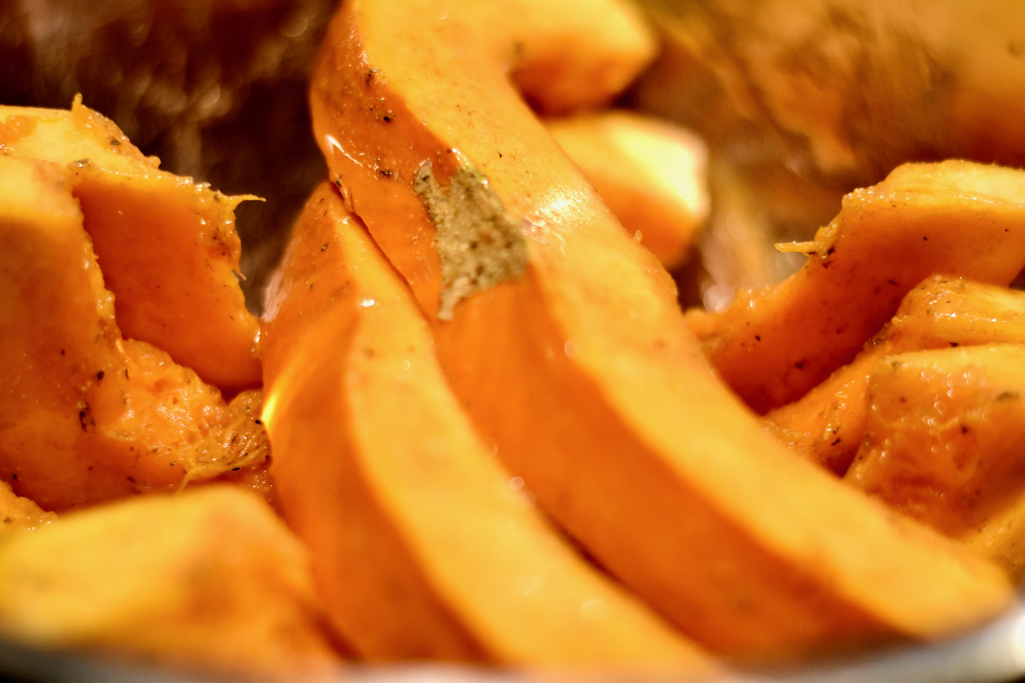 - Ik had een enorme klassieke pompoen van de buren gekregen uit eigen tuin. Geweldig! Dus veel te veel om helemaal te gebruiken voor dit gerecht. De supermarkt pompoenen kun je in zijn geheel gebruiken. Was de pompoen, halveer deze en snij plakken van ongeveer dezelfde dikte. Verwijder de pitten en draden. Doe in een kom olijfolie met de gemalen koriander en komijn met wat peper en zout. Haal de pompoen plakken hier doorheen zodat ze lekker bedekt zijn.