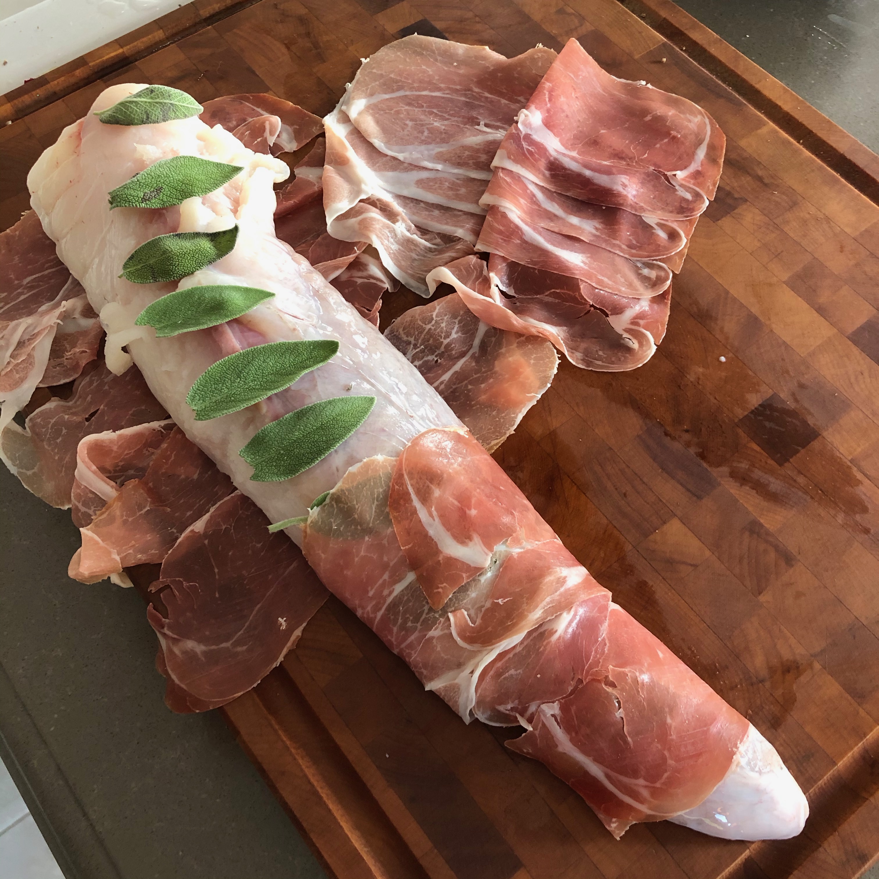 • We fueled the Green Egg to 200C and fitted it with the cast iron grid. This is nice and warm through and through and transfers this nicely to the fish. The fish itself is firm and fleshy, making the proscuito and sage a wonderful addition to this. Leave the filleted rump whole and arrange the slices of proscuito in a row lengthwise. Place a number of sage leaves and the fish on top.