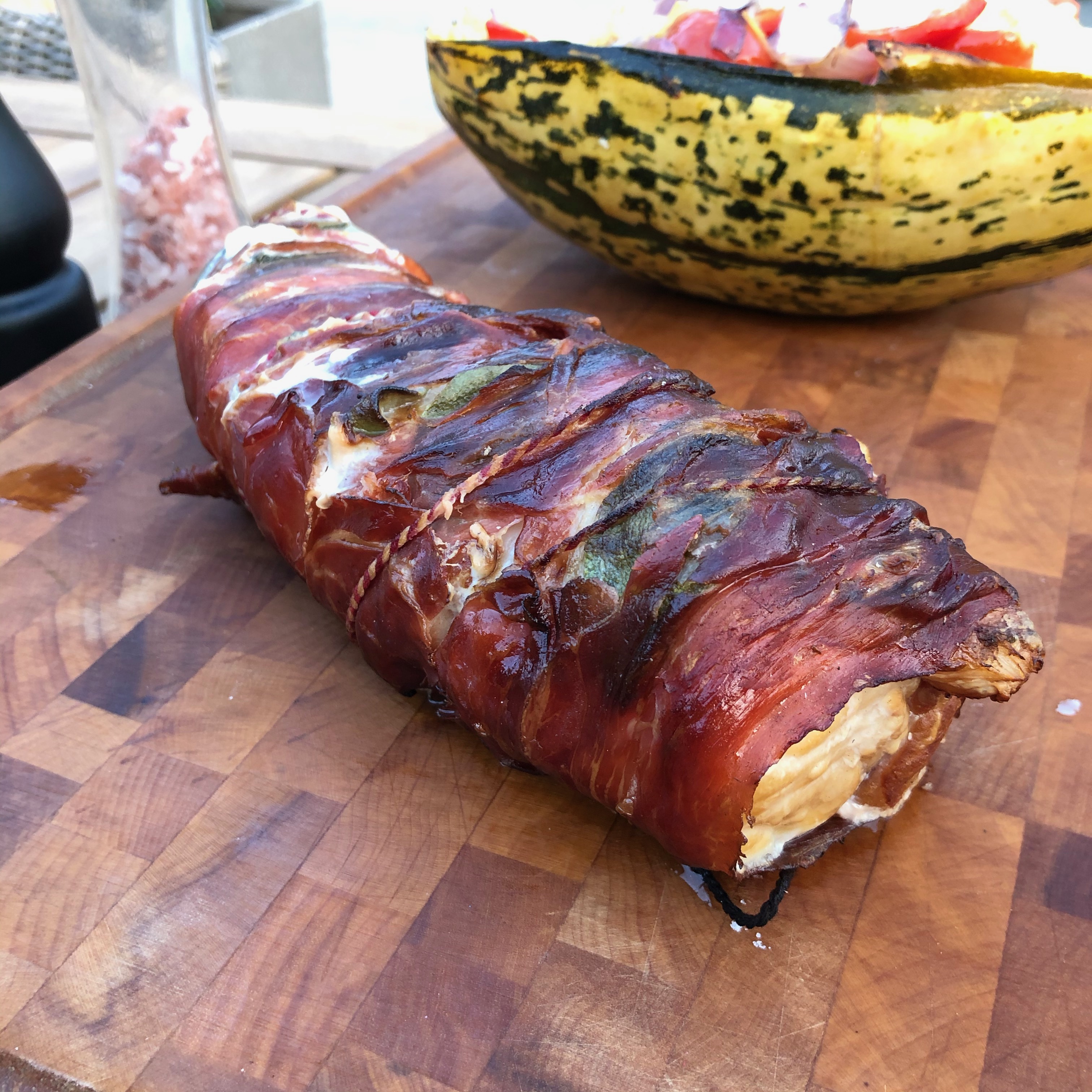 • Fold the slices of proscuito over the fish and use cooking twine to tie it tightly. When the Green Egg is at a nice 200C, place the monkfish on the cast iron grid. The target core temperature is 64C, then the monkfish is nicely cooked.